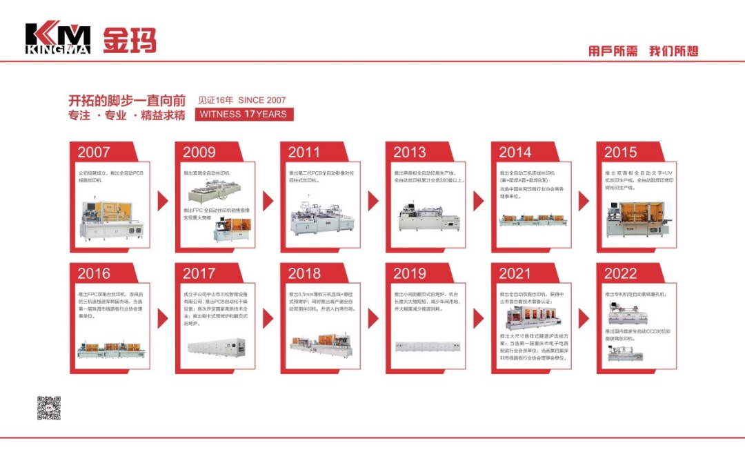 | 2007年 | 公司組建成立,推出全自動PCB線路絲印機; | |
